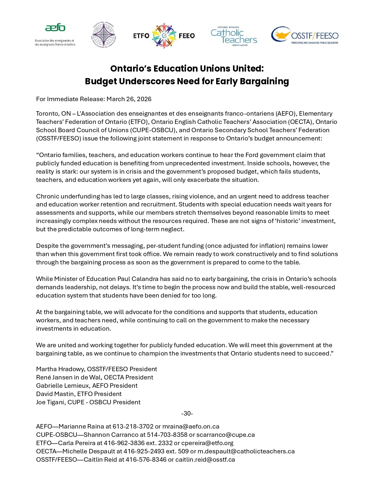 FINAL JOINT STATEMENT – Ontario Budget