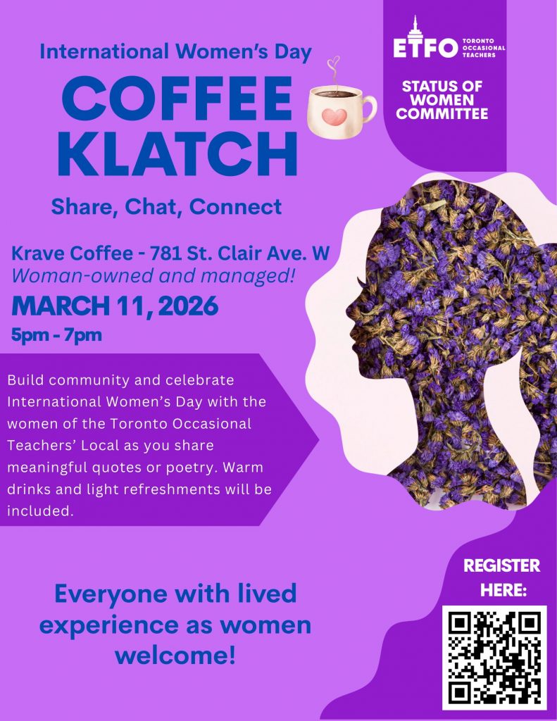 Build community and celebrate International Women’s Day with the women of the Toronto Occasional Teachers’ Local as you share meaningful quotes or poetry. Warm drinks and light refreshments will be included.