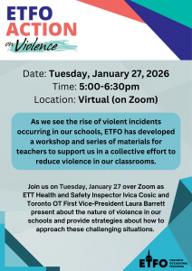 Join us on Tuesday, January 27 over Zoom as ETT Health and Safety Inspector Ivica Cosic and Toronto OT First Vice-President Laura Barrett present about the nature of violence in our schools and provide strategies about how to approach these challenging situations.