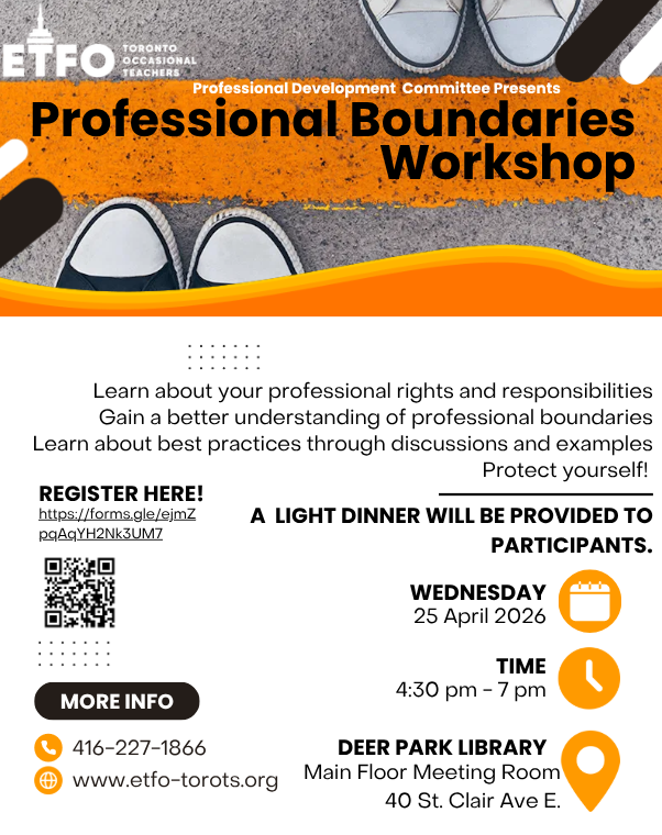 Occasional Teachers are having an increased number of allegations made against them. This workshop will advise members of their professional rights and responsibilities and provide a deeper understanding of the importance of professional boundaries. Through interactive discussions and real-world examples, members will learn about and apply best practices that will allow them to meet their responsibilities and protect themselves professionally. We will provide a light dinner for all participants.