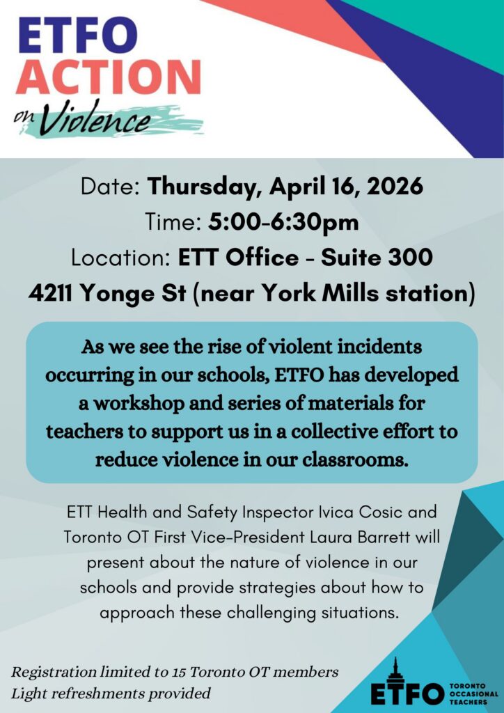 ETT Health and Safety Inspector Ivica Cosic and Toronto OT First Vice-President Laura Barrett will present about the nature of violence in our schools and provide strategies about how to approach these challenging situations.